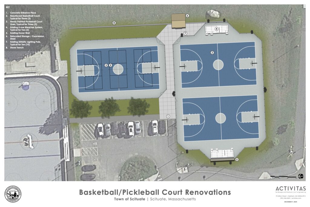 The Kazlousky Outdoor Courts are in need of repair and the Town of Scituate has approved funding to renovate them. The plan is to start the renovation in the Fall of 2025 with the hope of having them ready to go for the BIG AL 3 on 3 in June of 2026.